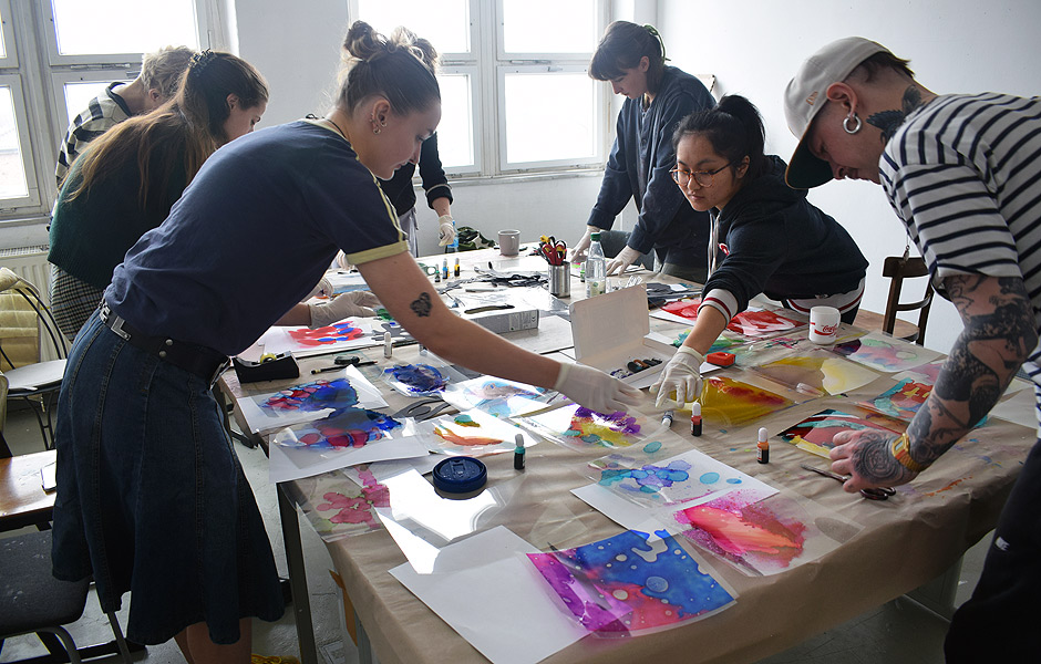 In preparation for tomorrow’s lesson, the participants will create watercolour paintings on clear plastic to be used for the collage/faux stained glass work the next day.