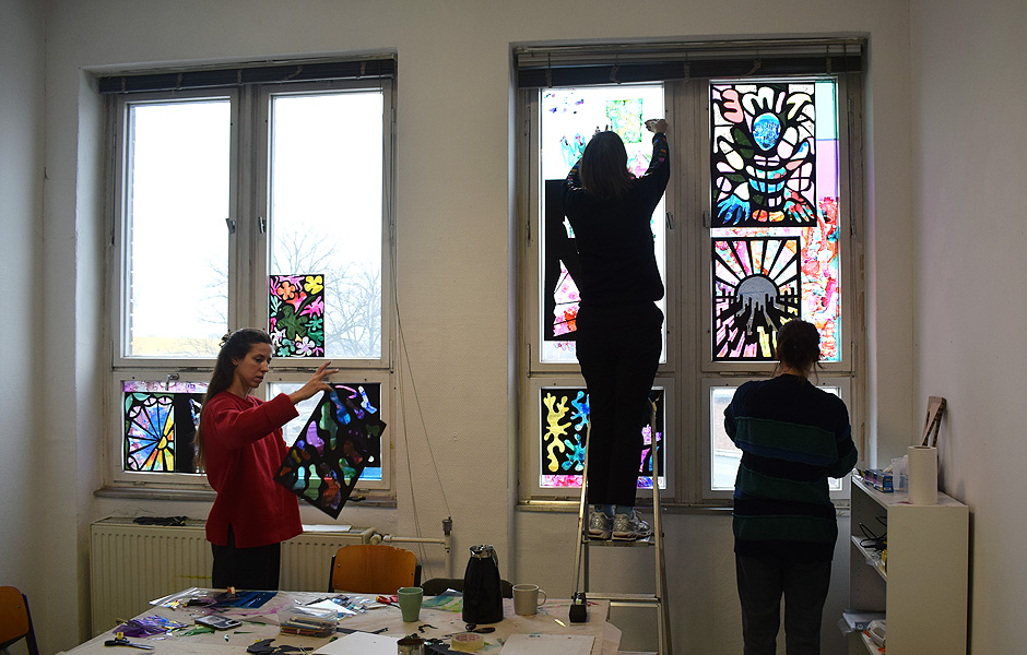 Installation of group exhibition on windows of BAI. Group discussion of work that was produced.