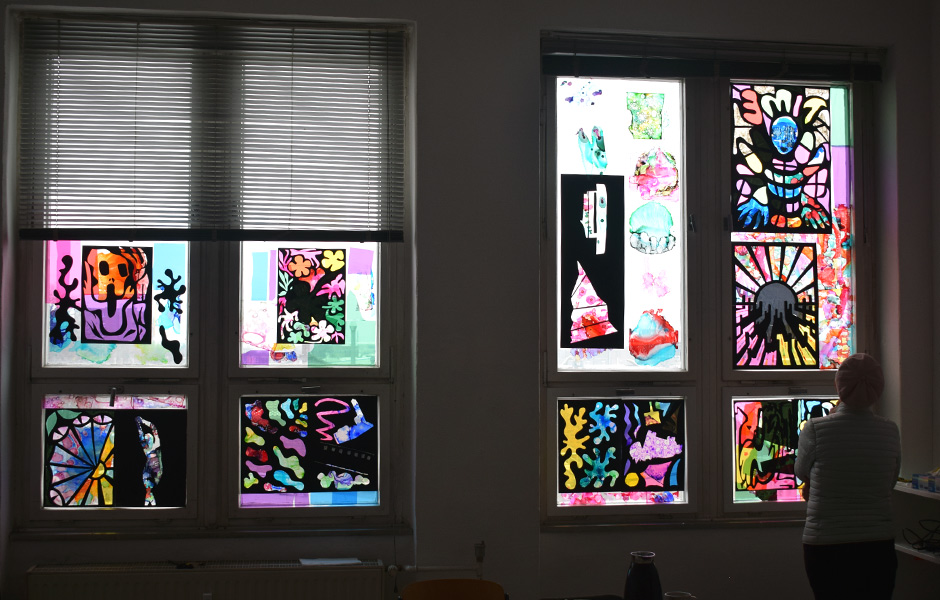 In the practical part of the class, we will learn how to create our own stained-glass simulation using black card. We will sketch a design based on our own inspiration based on either a figure or object. We will then cut our sketch into segments and choose colors that correspond to content and meaning. We will assemble these segments on a window frame to construct a collaborative window art piece with fellow participants. This will allow us to experiment with color theory, light transmission and composition principles.