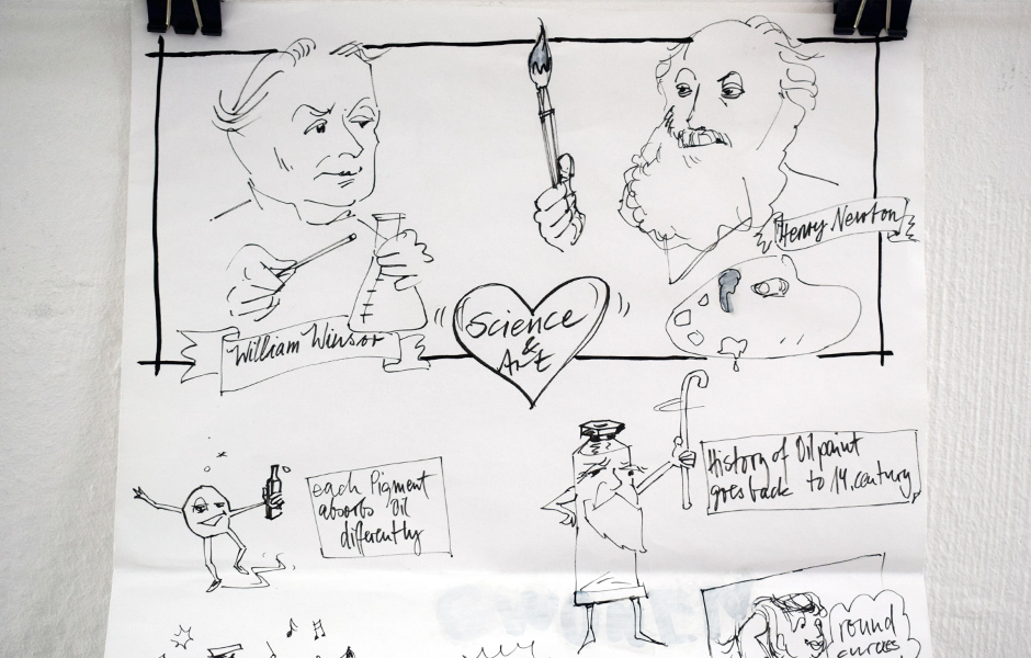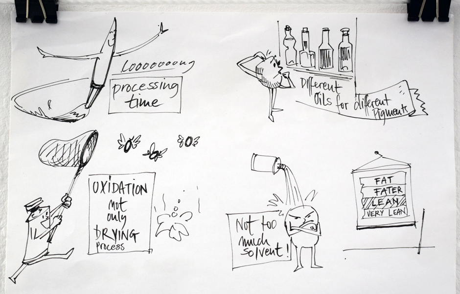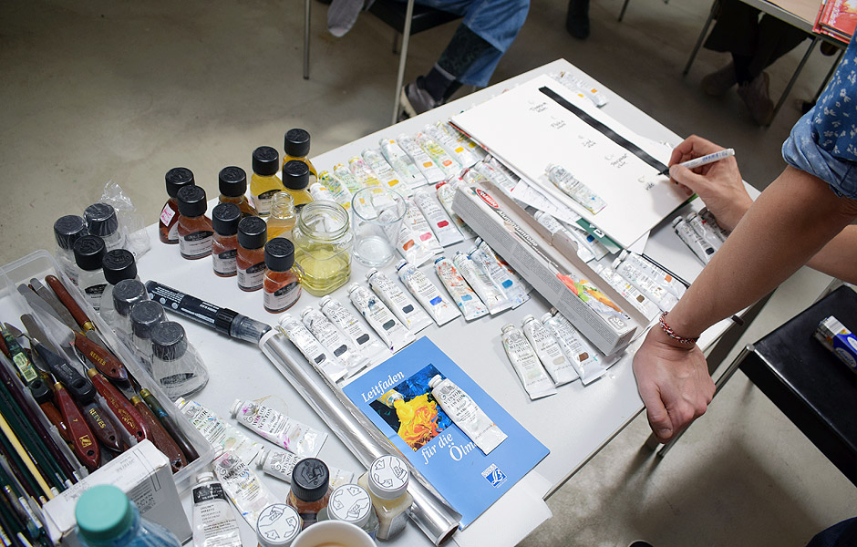 Diese Einheit erklärt die Herstellung und die Inhaltsstoffe von Ölfarbe. Wir vergleichen ausgewählte Pigmente nach ihren spezifischen Eigenschaften und ihrer Anwendung. Wir erörtern die Maßeinheiten Gewicht und Volumen, bezüglich der Arbeit mit Ölfarben, zeigen an Beispielen die chemischen, physikalischen und physischen Eigenschaften von Pigmenten, die ihre Erscheinungsform bedingen oder verändern, hinsichtlich Farbton, Deckkraft und Langlebigkeit. Verschiedene Lösungsmittel werden vorgestellt und der verantwortungsvolle Umgang mit ihnen vermittelt. In diesem Zusammenhang erstellen wir im Kurs ein eigenes Malmedium und teilen das Wissen um die vielfältigen Eigenschaften der verschiedenen Öle.“ (Text: Courtesy Mirjam Martinović & ColArt – The Fine Art Collective)