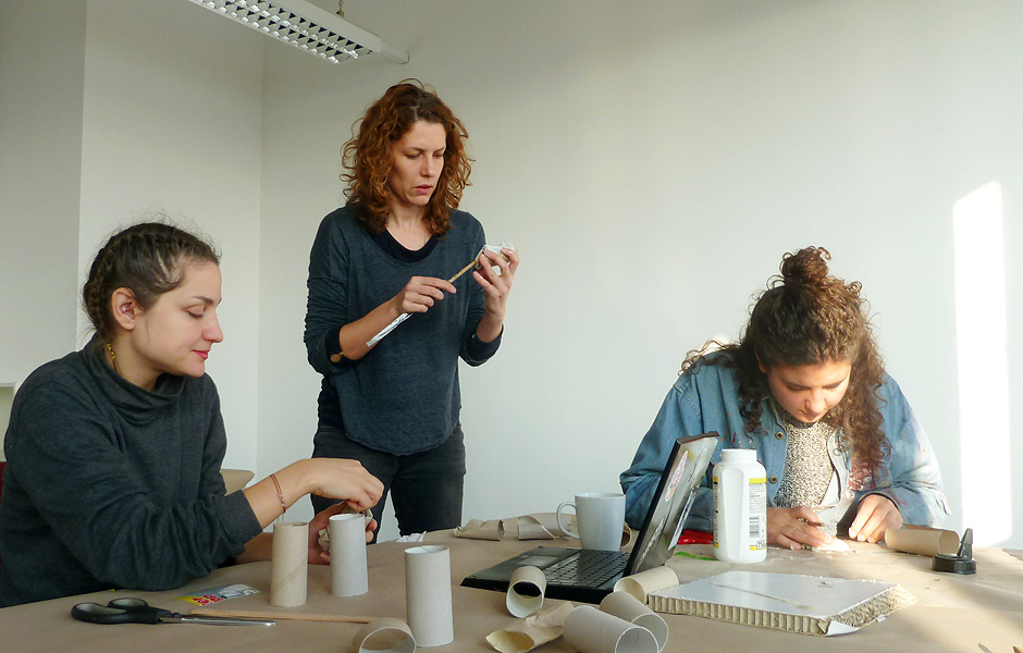 „In dem Workshop werden wir leichte Materialien aus dem Alltag benutzen, um dreidimensional zu arbeiten, z.B. Pappeverpackungen, Poster, Plasteflaschen, Trinkhalme, Tesaband, Kabelbinder … . Die Qualität dieser Materialien legt einen “rohen”, schnellen und improvisierten Zugang zum Workshopthema – Köpfe und Masken – nahe.