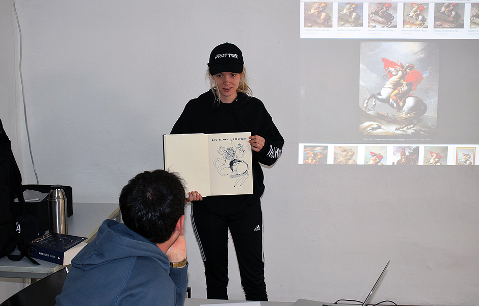 The seminar begins with an artist talk and an introduction and examples of art history and popular culture made on creative strategies and will be followed by studio visits and individual presentations of the participants. In the second step, individual projects will be discussed and developed by means of the artistic strategies of the “reenactment” and the appropriation (the artistic appropriation of “found” material). The results can be camera based (video or photography), performance based – or produced with any traditional artistic medium.” (Text by courtesy of Niklas Goldbach)