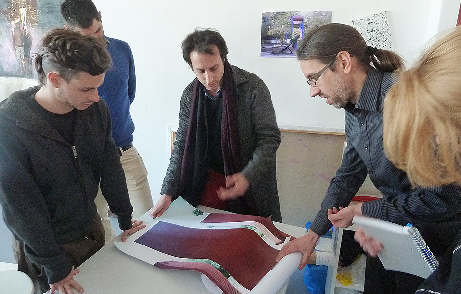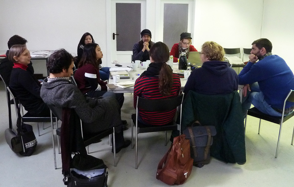 In einem fließenden Übergang zwischen Theorie und Praxis werden die Arbeiten der TeilnehmerInnen gemeinsam besprochen und inhaltliche und ästhetische Parallelen gezogen. Ist es möglich daraus ein Ausstellungskonzept zu entwickeln? Wie weit sind bestehende Netzwerke nützlich, um die Ausstellung umzusetzen und Aufmerksamkeit zu erzeugen.“ (Ann Schomburg & Sascha Boldt)