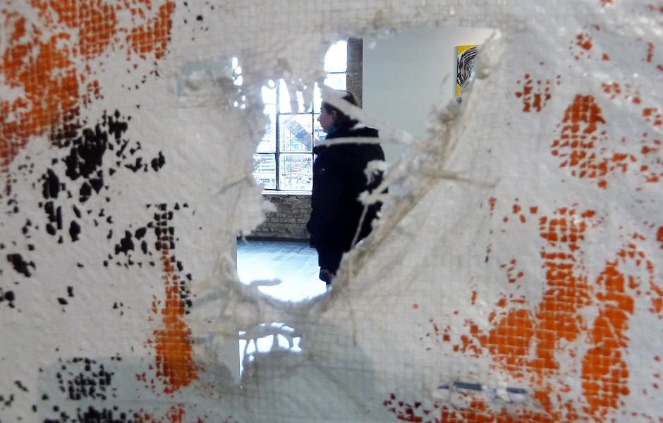 For Tomek, the construction and building sites scattering the city are endless sources of materials and plastic inspiration, whereby the relationship between building and demolition seems like a paradigm of the modern world, an aesthetics prone to détournements and dérives. The materials flow in, the materials come into confrontation, the colours are damaged, the accidents shape, and things are born. The exhibition “Thank You Boss” is a homage to the unknown and undetected aesthetics and “paintings” of construction workers, to the graffiti artists who ransack palisades, to the glass cleaners, to the roadside accidents that reshape the space, to the posters paste-ups, and time, that pulls them away.” (Text by courtesy of URBAN SPREE Galerie)